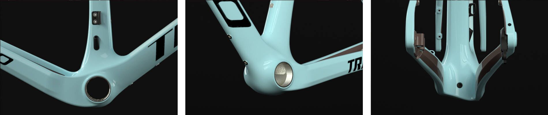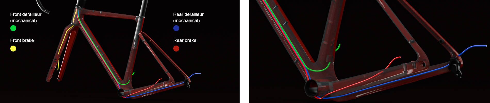 Achieving a clean, aerodynamic profile, the internal cable routing not only enhances the bike's aesthetics but also protects cables from the elements, ensuring smoother operation and reduced maintenance.