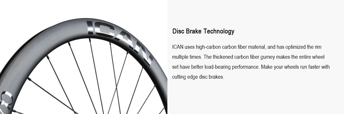 ICAN uses high-carbon carbon fiber material, and has optimized the rim multiple times. The thickened carbon fiber gurney makes the entire wheel set have better load-bearing performance. Make your wheels run faster with cutting edge disc brakes.